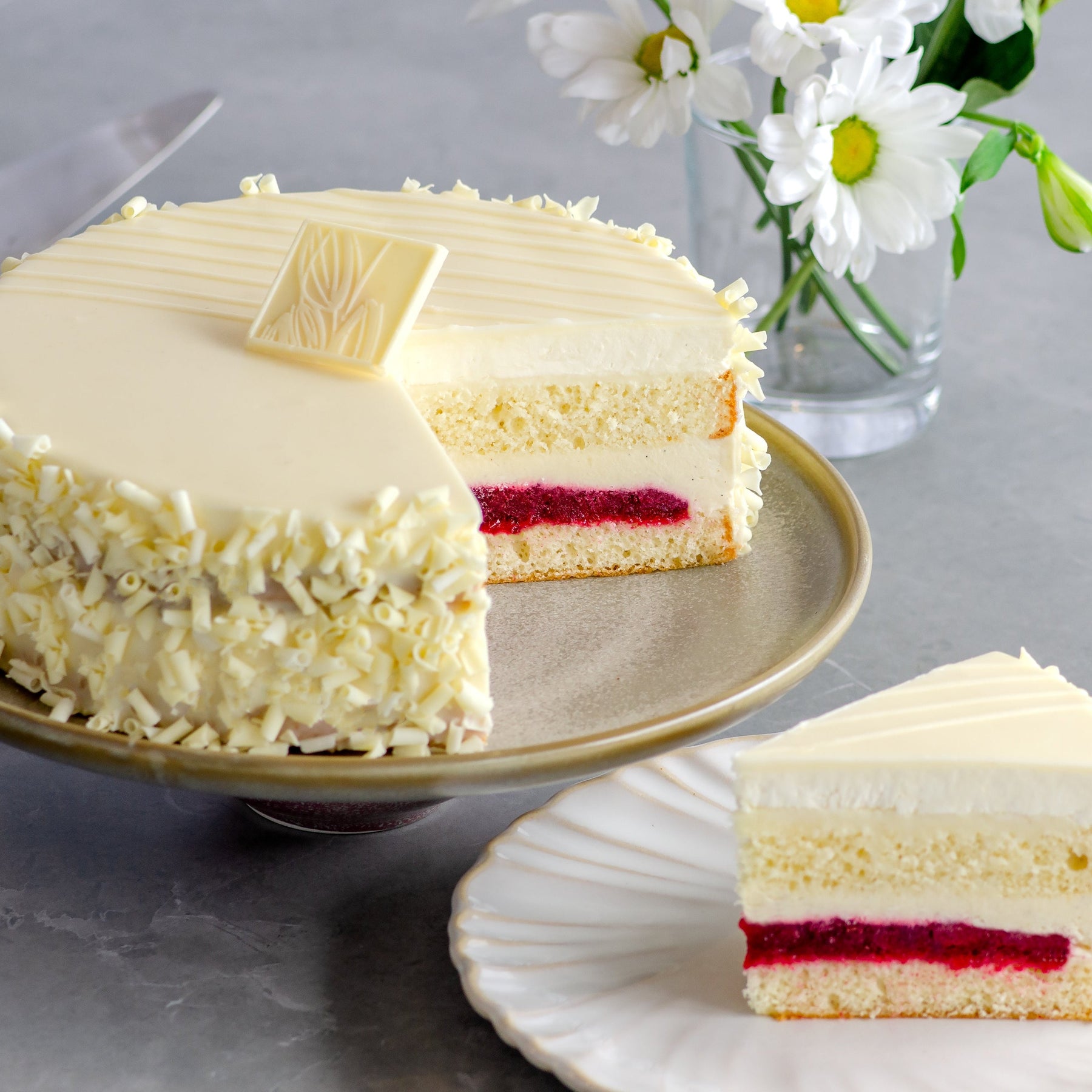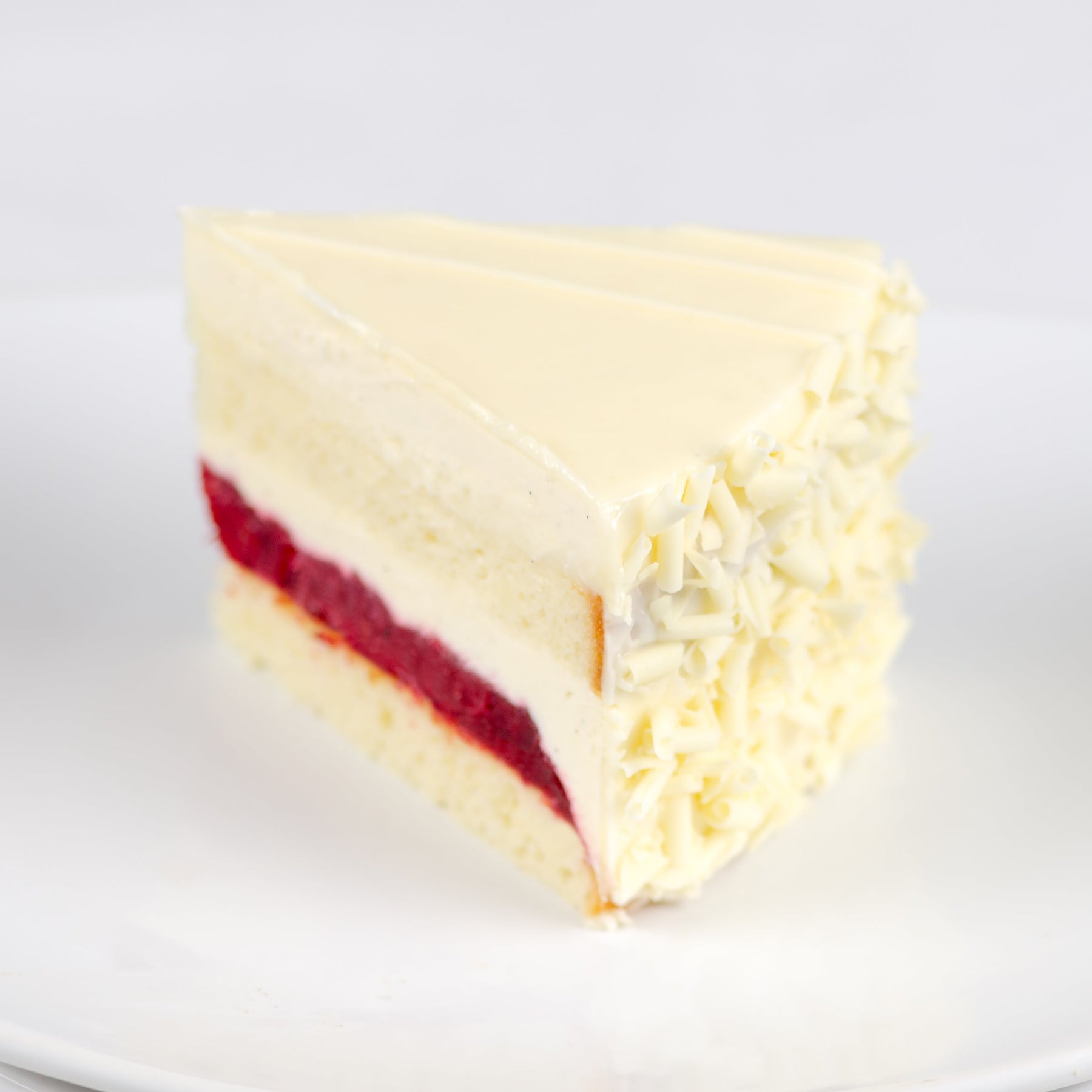 Delicate layers of white chocolate truffle made with Lindt white chocolate, homemade cranberry compote, and white sponge cake. Covered in white chocolate glaze and a Lindt white chocolate plaque.