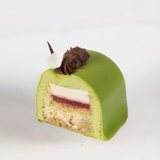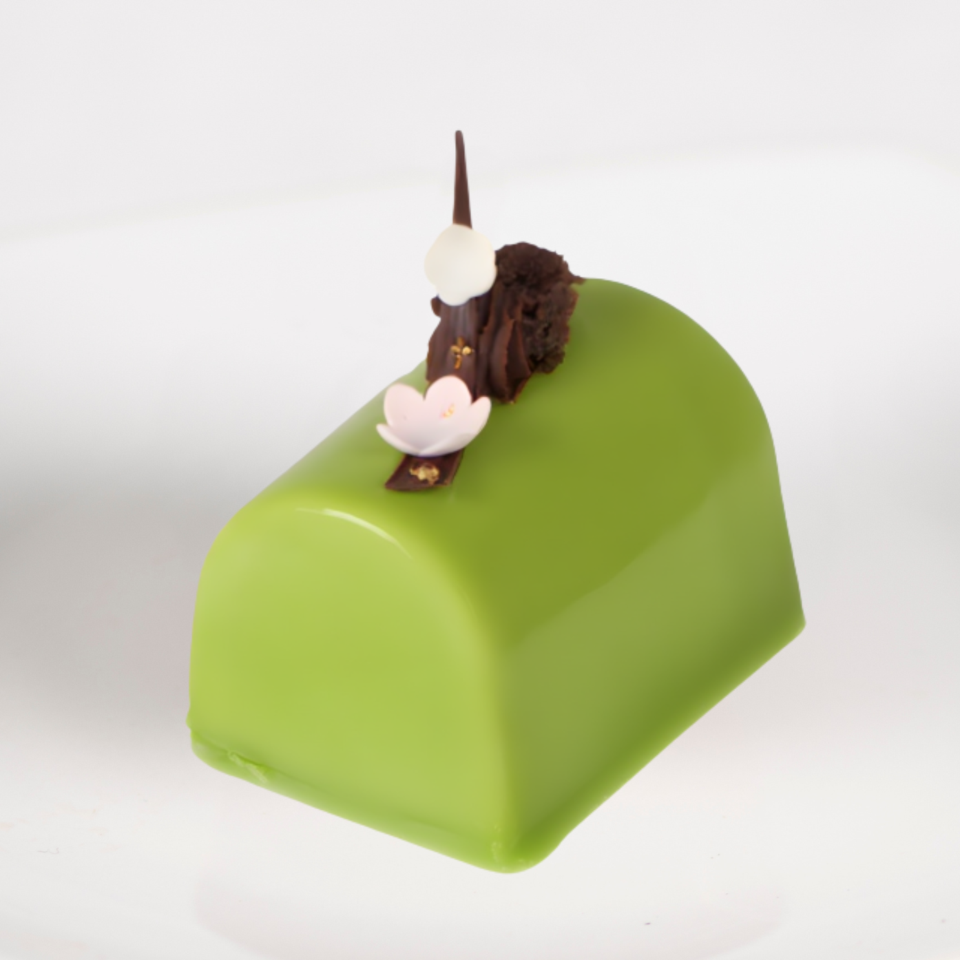 This heavenly dessert is a perfect combination of matcha mousse, Morello cherry jelly, raspberries, Chambord liqueur cream and sponge soaked with almond syrup. Decorated with a chocolate branch and blossom flowers.