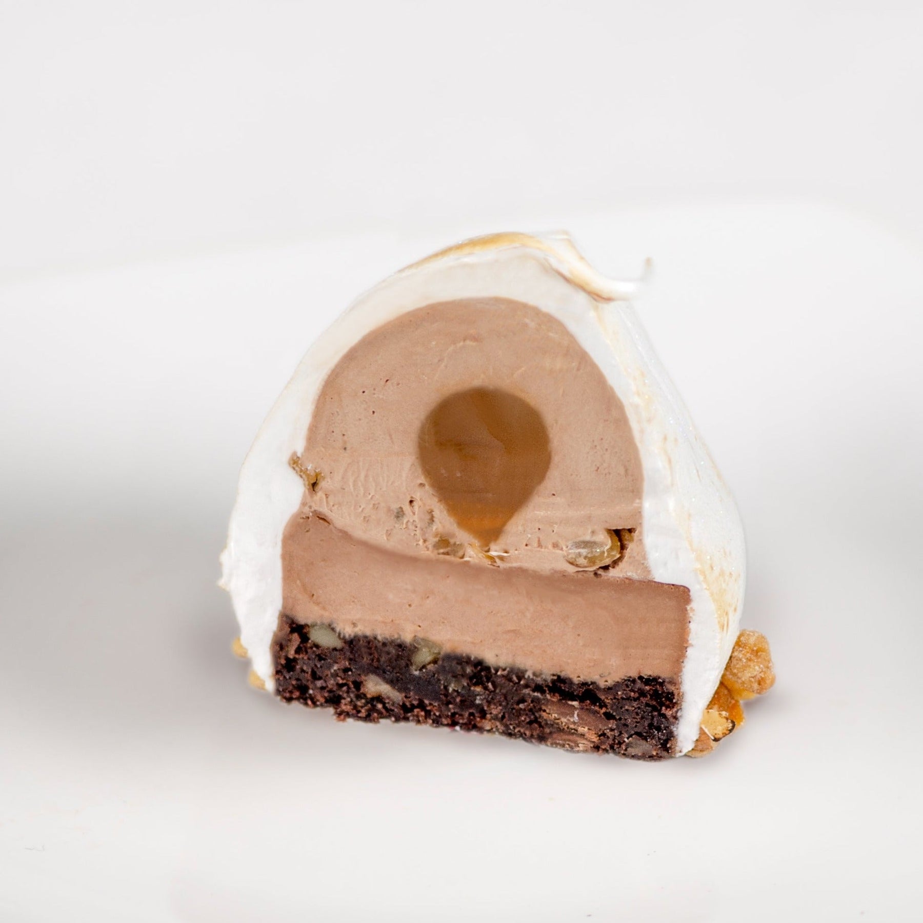 Our version of the rocky road cheesecake. Chocolate cheesecake, chocolate brownie, candied walnuts, buttery caramel, whipped chocolate ganache. Dipped in Italian meringue and decorated with chocolate "skis".
